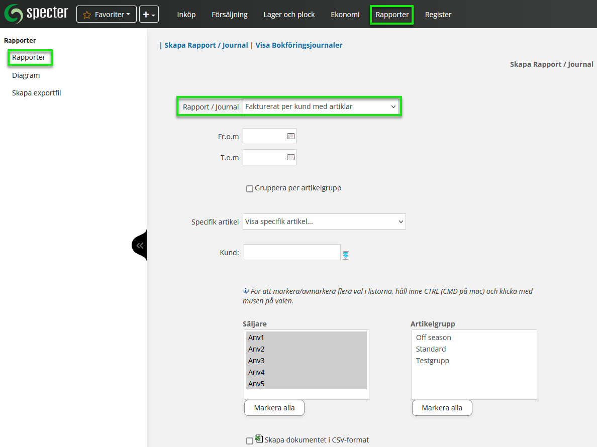 Kan även användas för att se vilka kunder som köpt en viss artikel (välj en artikel under Specifik artikel) och för att se hur mycket och vilka artiklar en viss kund köpt (välj kund under Specifik kund).
