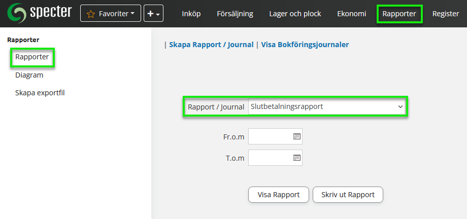 Visar de fakturor som slutbetalats under vald tidsperiod, sorterat på fakturanummer.