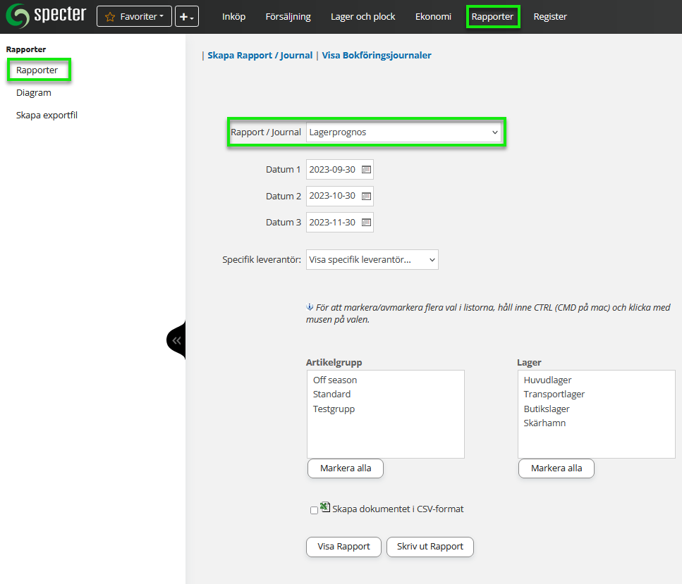 Rapporten Lagerprognos specificerar hur det ser ut idag utifrån saldo, in/utleveranser och hur det eventuellt kommer att se ut kommande tre perioder. Lagerprognosen visar även artiklar som har både noll inlevererade och noll i utlevererade antal. Med hjälp av lagerprognosrapporten kan man identifiera så kallade "hyllvärmare" som inte har någon lagerrörelse under perioden som rapporten avser.