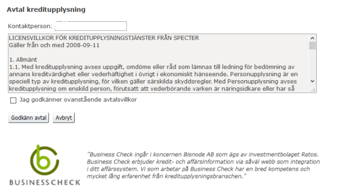 För att nyttja tjänsten måste avtal om kreditupplysning godkännas av administratören. Detta görs i Specter under Kunder. För att endast godkänna avtalet kan ett fiktivt organisationsnummer väljas under “Ny kund”, se nedan.