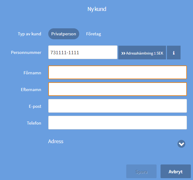 Klicka på Ny kund i kassan och välj vilken typ av kund det gäller