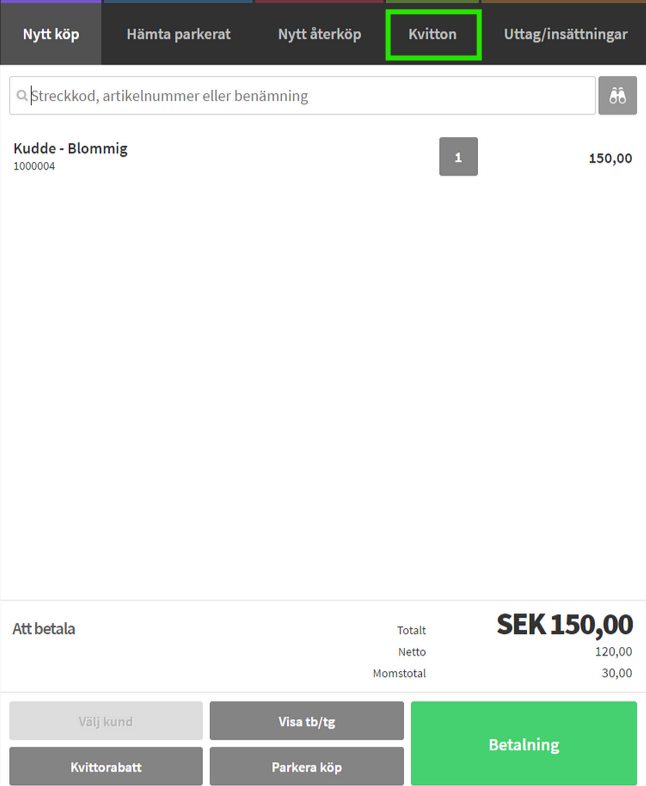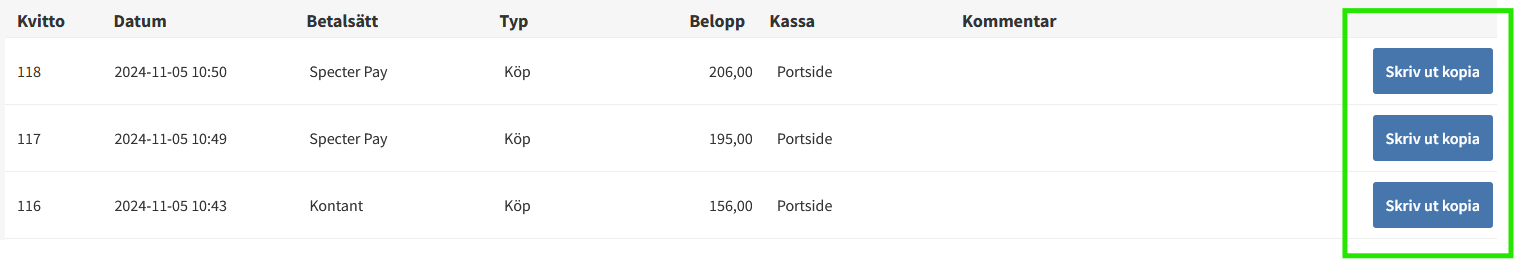 Obs att det enligt Skatteverkets regler, enbart är tillåtet att skriva ut EN kvittokopia. När detta är gjort kommer knappen att gråas ut och ingen ytterligare kopia är möjlig att skriva ut. Specters kundtjänst har inte heller någon möjlighet att trigga fler kvittokopior.