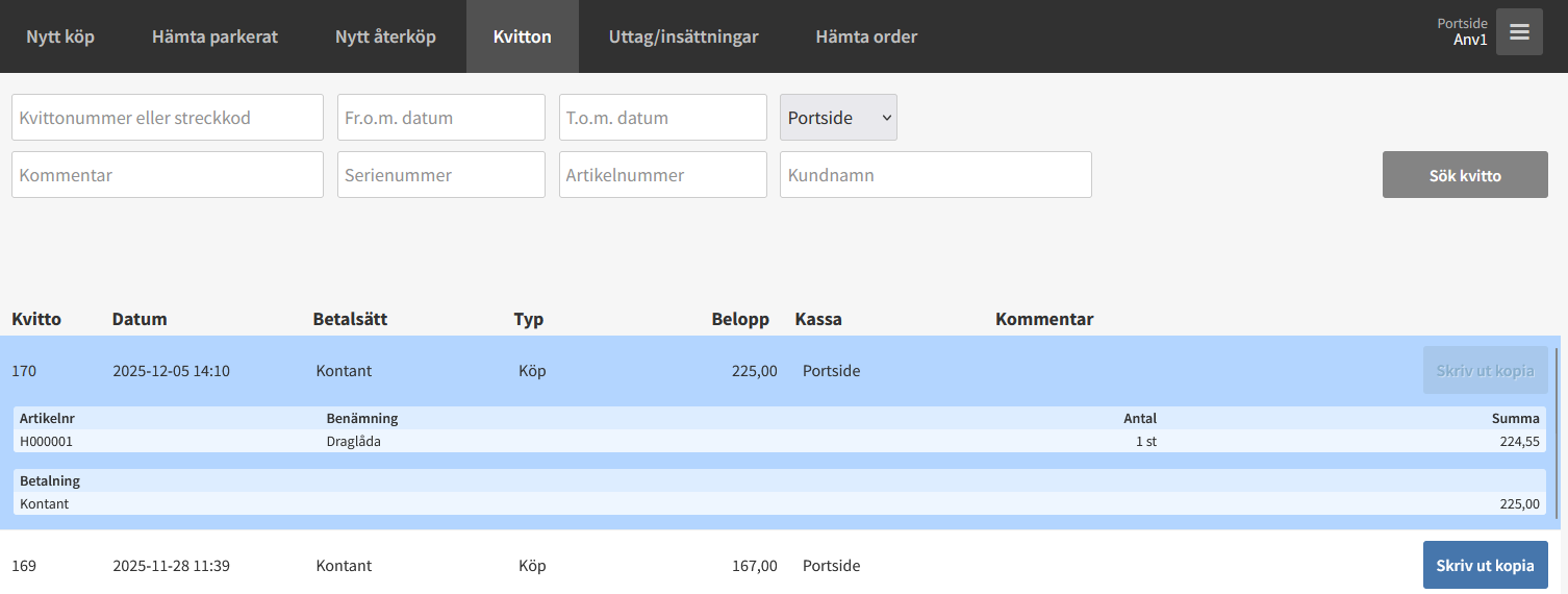 För att se innehåll på kvitto, klicka på önskad kvittorad. Där ser ni artikelnummer, benämning, betalsätt, antal och belopp.