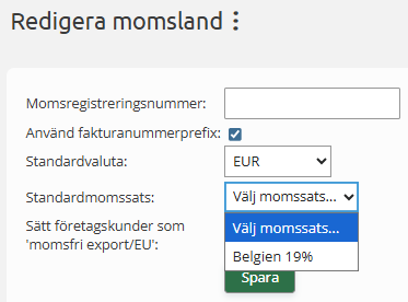 Välj den nya momssatsen under Ekonomi i den översta menyn, Inställningar till vänster och Momsländer. Välj ikonen papper med penna för att redigera: