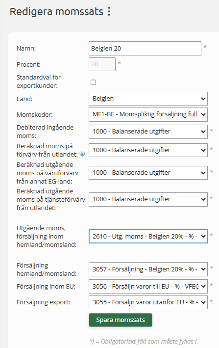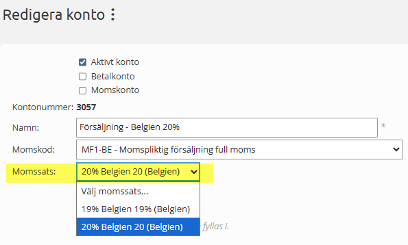 Lägg till en ny momssats under samma sökväg (Valet "Ny momssats" längst uppe till höger) med land, ny procentandel, och rätt konton. Detta gör att den nya momssatsen kopplas korrekt till landet, och den gamla momssatsen ersätts.OBS! Innan du kopplar samma konton som tidigare får du gå in i kontoplanen och byta benämning eller skapa nytt konto. Se under Momsländer, välj den nya momssatsen. Detta omfattar såväl försäljningskonton som är specifika för landet.