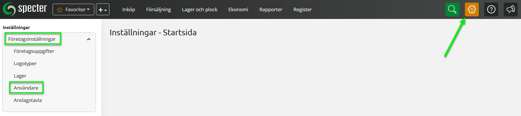 För att kontrollera/sätta korrekta rättigheter för användarna i ditt Spectersystem så klickar du på Inställningar/Kugghjul i övre menyn - Företagsinställningar/Användare i vänster meny följt av att du klickar på ikonen med ett hänglås