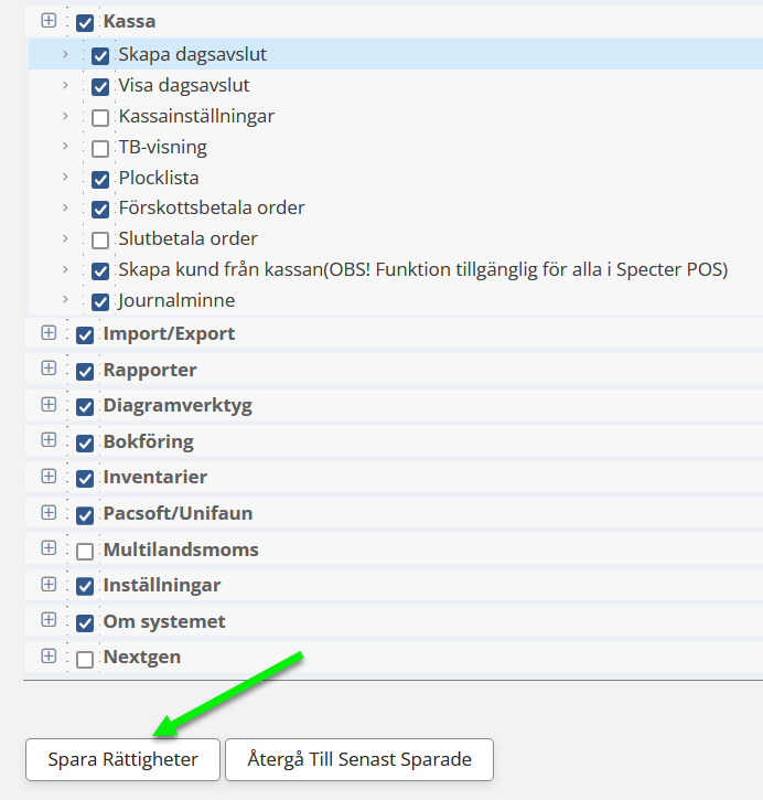 Om du gör någon förändring dvs kryssar i/ur någon rättighet så måste du klicka på knappen "Spara Rättigheter" för att spara dina ändringar.