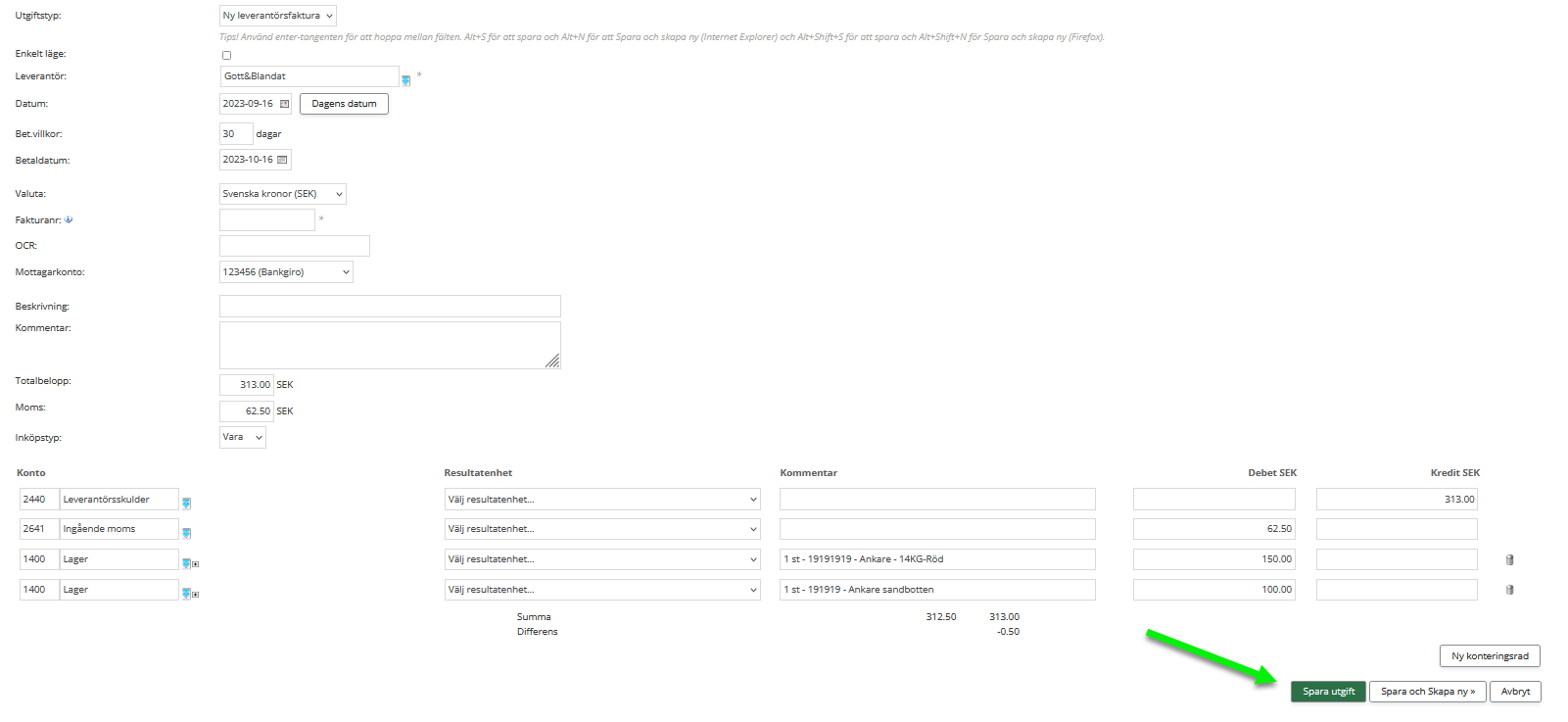 Det skapas en leverantörsfaktura under utgifter vid valen leveransfaktura och slutfaktura där ni kan ändra eller lägga till uppgifter om det skulle behövas. Spara därefter utgiften. Utgiften kan nu editeras fram tills dess att den blir bokförd.