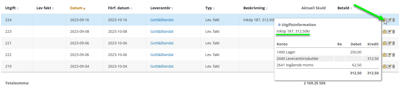 Beskrivningen visas även under utgiftsinformationen när nu håller ovanför konteringen.