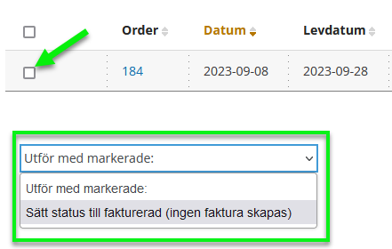 Vid valet Leveransfaktura kan man välja att fakturera alla leveranser, om sådana finnss, eller delfakturera leveranser. Det visas en checkbox vid alla leveranser som du bockar ur om du vill delfakturera.