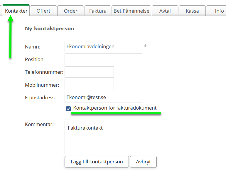 Under fliken kontakter kan du skapa en ny kontakt, tex ekonomiansvarig --> bocka i rutan för kontaktperson för fakturadokument.