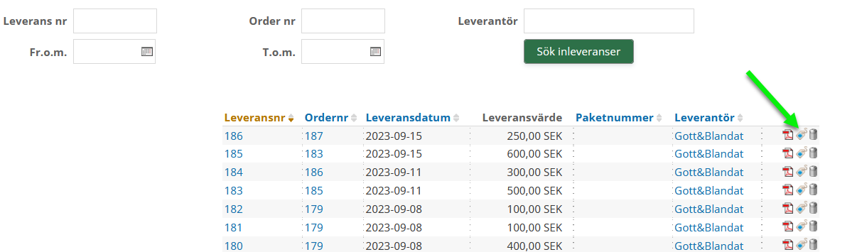 Gå till inköp, vänster meny --> sök inleveranser, övre menyn -->Sök upp inleveransen via någon av sökkriterierna såsom ordernummer och leveransnummer.