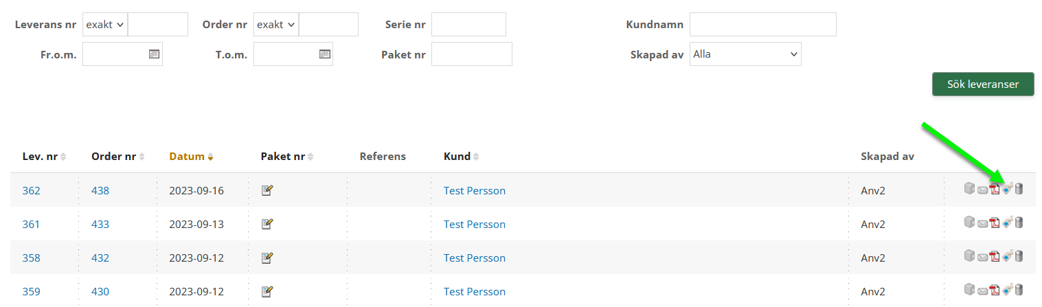 Gå till order, vänster meny --> sök leveranser, övre menyn -->Sök upp utleveransen via någon av sökkriterierna såsom ordernummer och leveransnummer.
