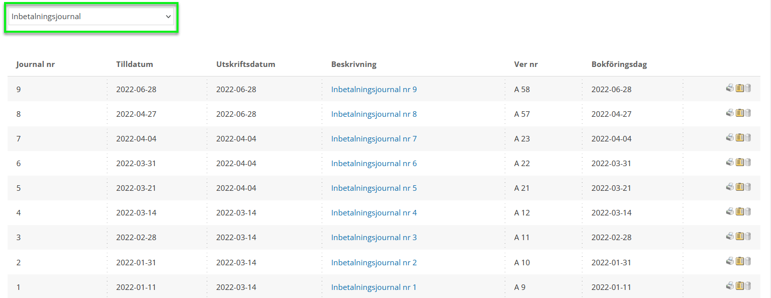 Du kan också hitta de redan skapade journalerna om du väljer Rapporter/Journaler i vänster meny -> Visa Bokföringsjournaler i övre menyn. Där väljer du vilken journal du vill se.