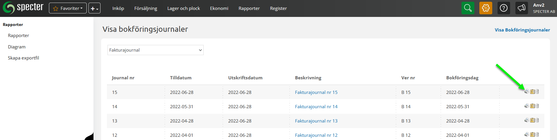 Du kan också hitta de redan skapade journalerna om du väljer Rapporter i övre meny -Rapporter i vänster meny och "Visa bokföringsjournaler". Där väljer du vilken journal du vill se.