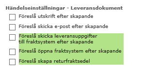 Man skall också se till att "Skicka leveransuppgifter till fraktsystem" är ikryssad då det är det valet som gör att något överhuvud taget skickas till fraktsystemet. Man kan också ha "Öppna fraktsystem" ikryssad om man vill att fraktsystemet öppnas i ett separat fönster efter det att leveransen är gjord så att man kan behandla den där och skriva ut fraktsedel för leveransen.