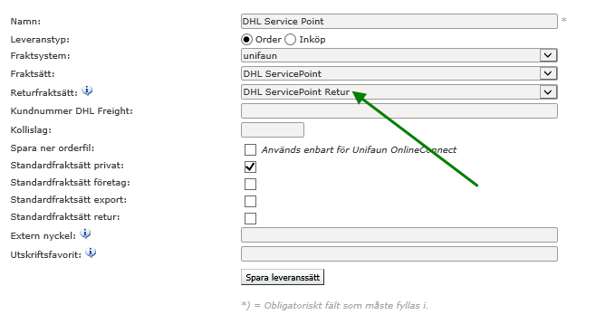 Det man ska säkerställa, för att returerna skall bli korrekta och att man skall slippa få återläsning till systemet på returen, är att titta på valet för "Returfraktsätt". Där skall returmotsvarigheten till det fraktsätt man valt på raden ovanför vara valt.
