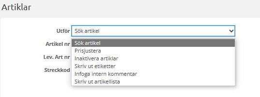 I urvalsvyn för artiklar kan du göra olika val med "utför":