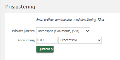 Du kan justera Inköpspris, Försäljningspris eller Inventeringspris (i alla valutor i systemet). Prisjusteringen kan antingen vara i procent eller ett fast belopp.