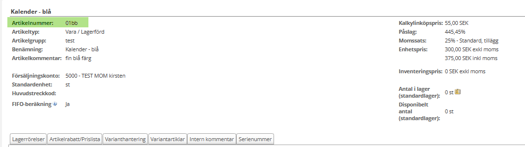 Genom att klicka på Artikelnumret kommer du till ”Artikelkortet” med all information om artikeln praktiskt samlad under olika flikar. Välj ”Editera Artikel” i menyn i överkanten för att få möjlighet att ändra informationen på artikeln.