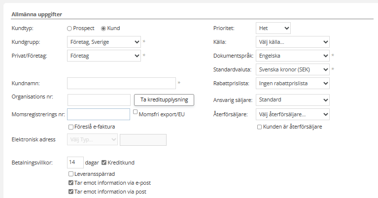 Kundtyp visar om kunden skall vara en Kund eller prospect.