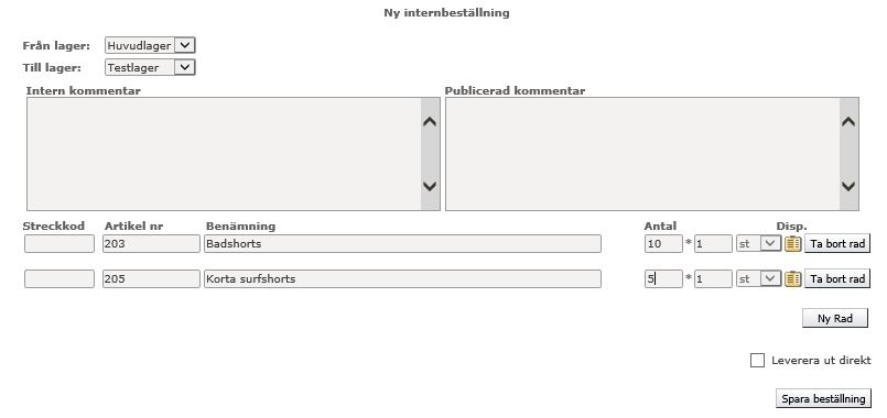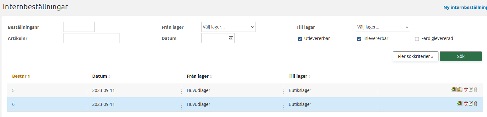 Om ni har flera lager eller butiker finns möjligheten att göra interna beställningar för varor som skall flyttas mellan era lager/butiker. Varje butik kan t.ex. beställa varor från ett huvudlager, under transporten placeras varorna i ett transportlager. Vill du bara göra en vanlig lagerflytt görs även detta enkelt.