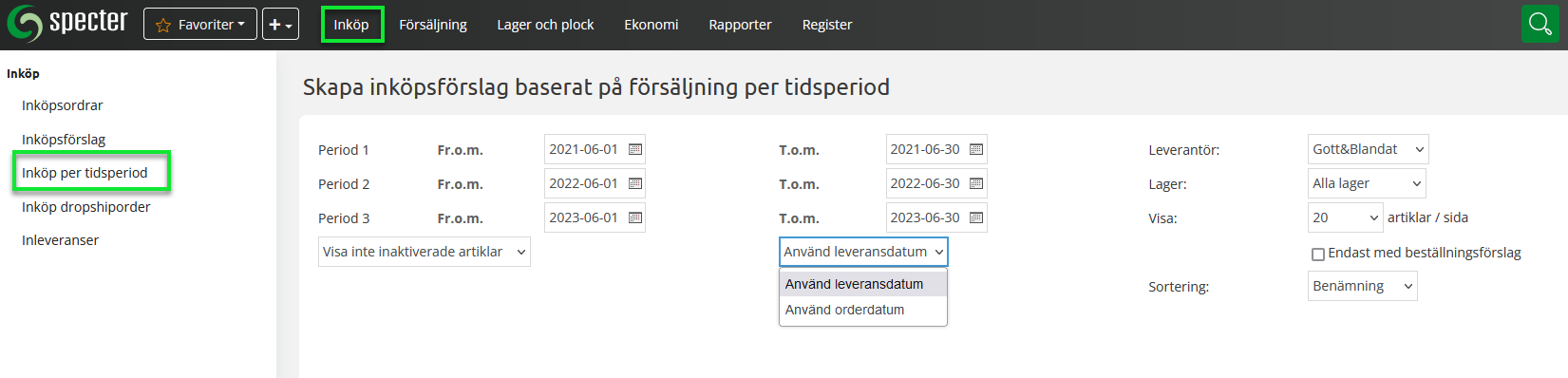 Som en hjälp i inköpsprocessen finns menypunkten ”Inköp per tidsperiod”.