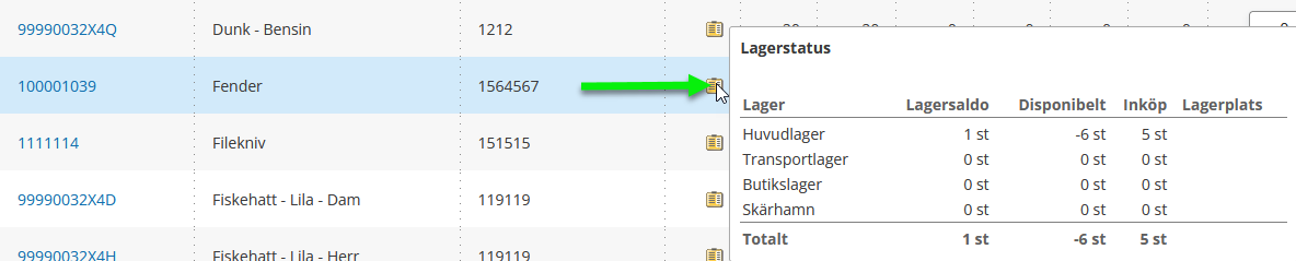 ) får du fram information om vad artikeln har för lagersaldo på varje lager (både disponibelt och fysiskt), och även hur många som är beställda och ännu ej inlevererade.