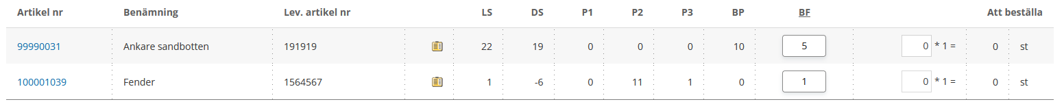 - Beställningspunkt (BP); om ingen beställningspunkt finns angiven på artikeln så visas ”0”.