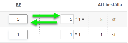 Om inte artikelregistret är uppdaterat, med ”Beställningspunkt”, ”Förpackningsstorlek” samt ”Antal att beställa”, visas beställningsförslag på de artiklar som uppvisar ett negativt värde på disponibla lagersaldot.Om du klickar på rutan ”BF” flyttas de antal artiklar som anges som beställningsförslag övertill”Antal att beställa”.
