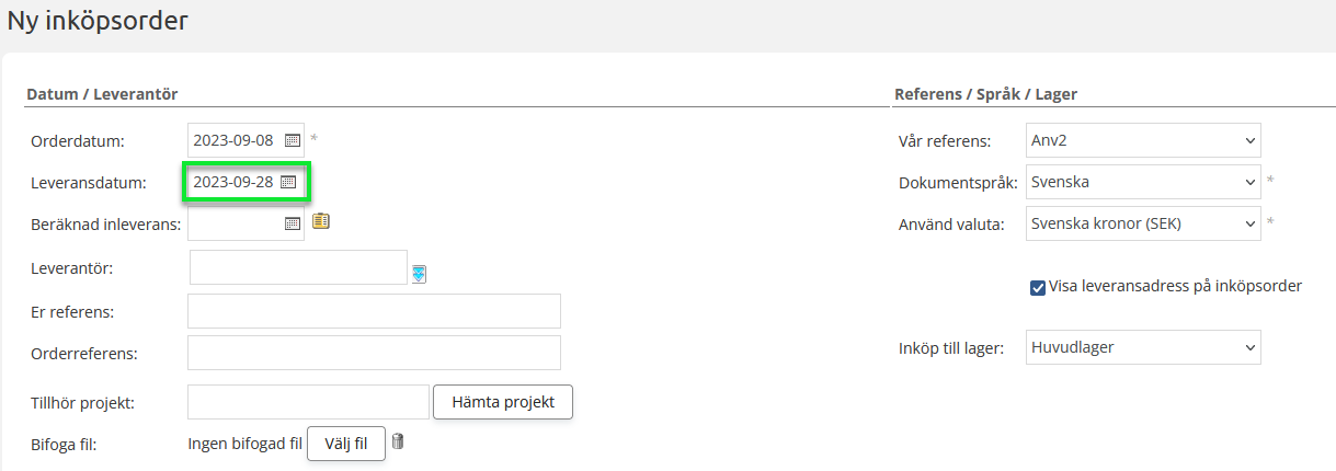 Orderdatumen och leveransdatumen kommer upp per automatik utefter inställningarna som är inlagda i systeminställningarna.