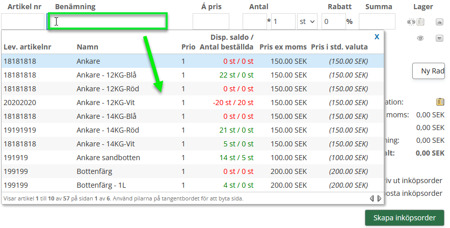 När du väljer Artikel nr eller Benämning kommer rullgardin med de artiklar som finns registrerade på vald leverantör upp (är det många artiklar ange artikelns benämning eller artikelnumret), markera aktuell artikel och ange antal.