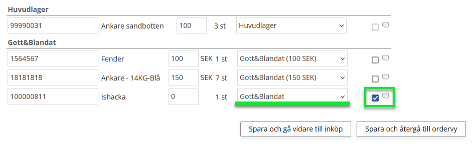 Spara och återgå till ordervy – här kan man fortsätta att bereda övriga kundorder, när alla är genomgångna väljer man att gå vidare till inköp.