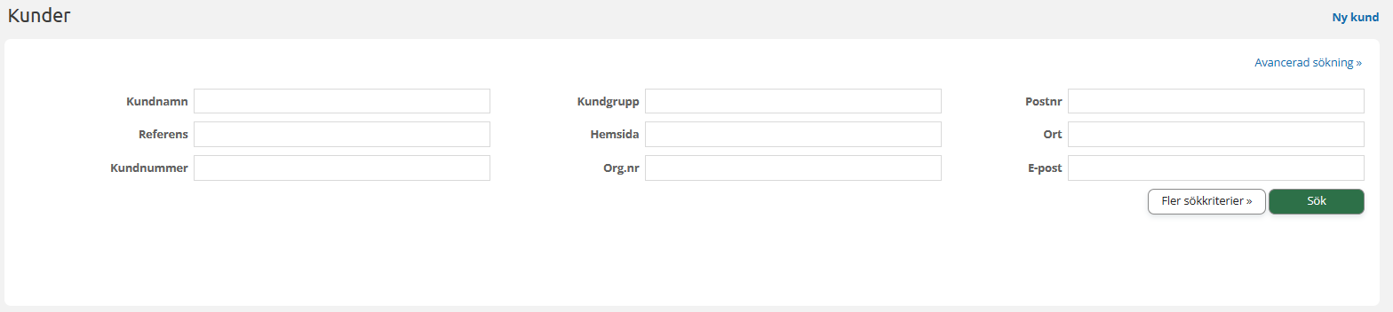 På kundsidan kan du söka upp dina kunder på ex kundnamn och kundnummer. Om man även trycker på "Fler sökkriterier" så visas ytterligare sökalternativ.