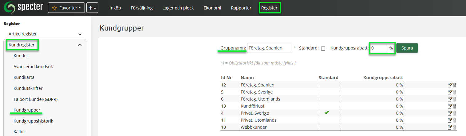 Under menyvalet "Register" i övre menyn och Kundregister/Kundgrupper i vänster meny hittar ni och kan lägga till kundgrupper. Här kan olika kundgrupper skapas. För att skapa en ny kundgrupp skriv in namnet för kundgruppen i fältet Gruppnamn, ange om den skall vara standard vilket innebär att nya kunder automatiskt kommer i den gruppen och ange om kunder i kundgruppen skall ha rabatt på sina köp.