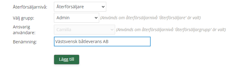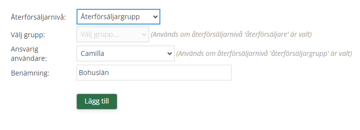 När gruppen är upplagd kan återförsäljare läggas upp. Välj vilken grupp återförsäljaren skall tillhöra och deras namn. Ansvarig säljare blir den som är ansvarig för gruppen