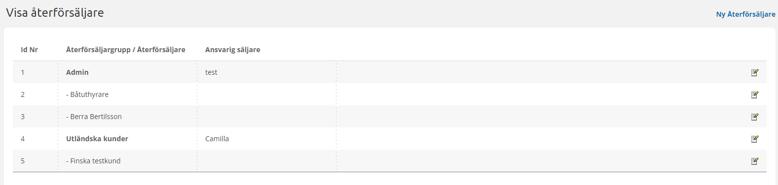 Under Återförsäljare visas de ombud/återförsäljare som är upplagda. Här kan man skapa nya återförsäljare och återförsäljargrupper.
