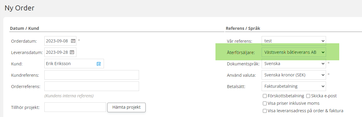 När order skrivs på kund så hämtas uppgift om vilken återförsäljare kunden tillhör.