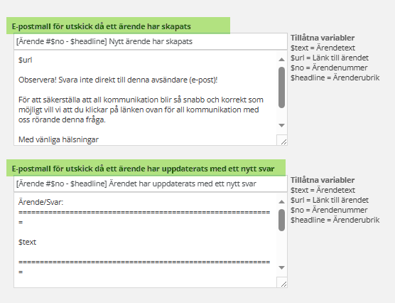 Det finns två E-postmallar som du når via det gula kugghjulet högst uppe till vänster - Grundinställningar och Systeminställningar. E-postmall som skickas till kund om ett ärende skapas i systemet och/eller då ett ärende har uppdaterats med ett nytt svar. Dessa har namnen ”E-postmall för utskick då ett ärende har skapats” och ”E-postmall för utskick då ett ärende har uppdaterats med ett nytt svar”. I dessa mail kan variablerna som är synliga i listan till höger användas för att hämta upp diverseuppgifter kring ärendet.
