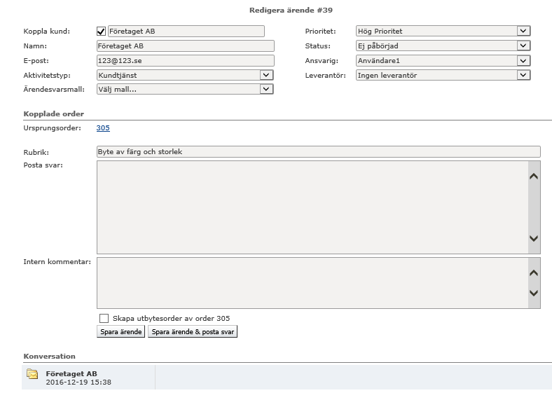 För att spara ärendet så klickar vi på knappen ”Spara ärende” och om vi vill posta vårt svar så klickar vi på knappen för ”Spara ärende & posta svar”. Vi här i detta läge även möjlighet att ändra statusen på vårt ärende. Ett nyskapat ärende får automatiskt statusen ”Inväntar svar” och när kunden besvarat ärendet via länken som skickas till kundens e-postadress så sätts statusen till ”Att besvara”. Om behandlingen av ärendet slutförs genom vårt svar så ändrar vi statusen på ärendet till Slutförd innan vi sparar och postar vårt svar till ärendeläggaren. Längre ner på sidan, under rubriken ”Konversation:”, ser vi de svar som vi skickat till samt mottagit från ärendeläggaren.