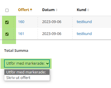Offerter kan snabbt skrivas ut från offertvyn, bocka i valda offerter samt markera ”Skriv ut offert” i rullgardinslisten. Vill du skriva ut alla offerter som presenteras på sidan, bocka i den översta rutan så markeras alla offerter.