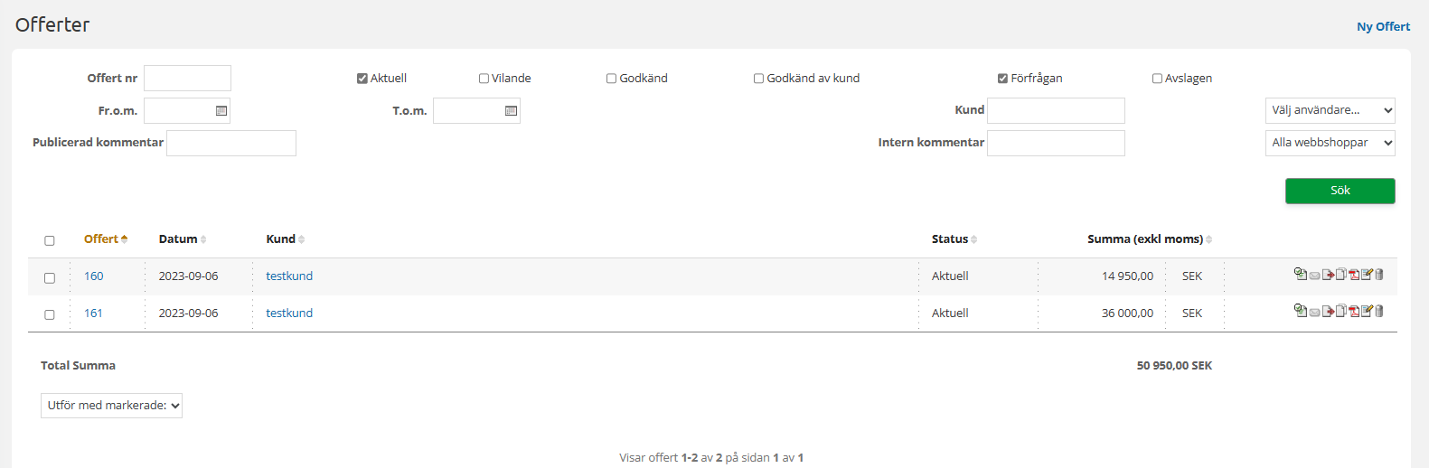 Sökningen kan filtreras på flera olika sätt, däribland offertens status, datum, kund, kommentarer, webshopar och användare.
