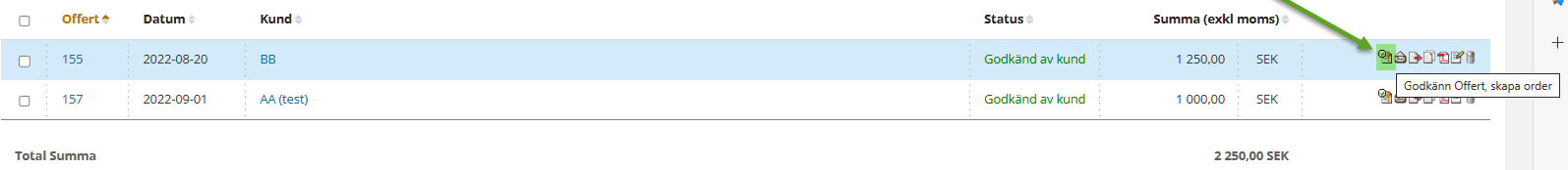 Leta reda på offerten. Till höger om kundnamnet finns en rad med små ikoner. En av dem heter ”Godkänn Offert, skapa order” (
