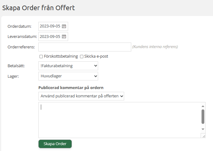 Klicka på den och du kan skapa en order av din offert. Fyll i orderdatum, önskat leveransdatum och eventuellt kundens orderreferensnummer.