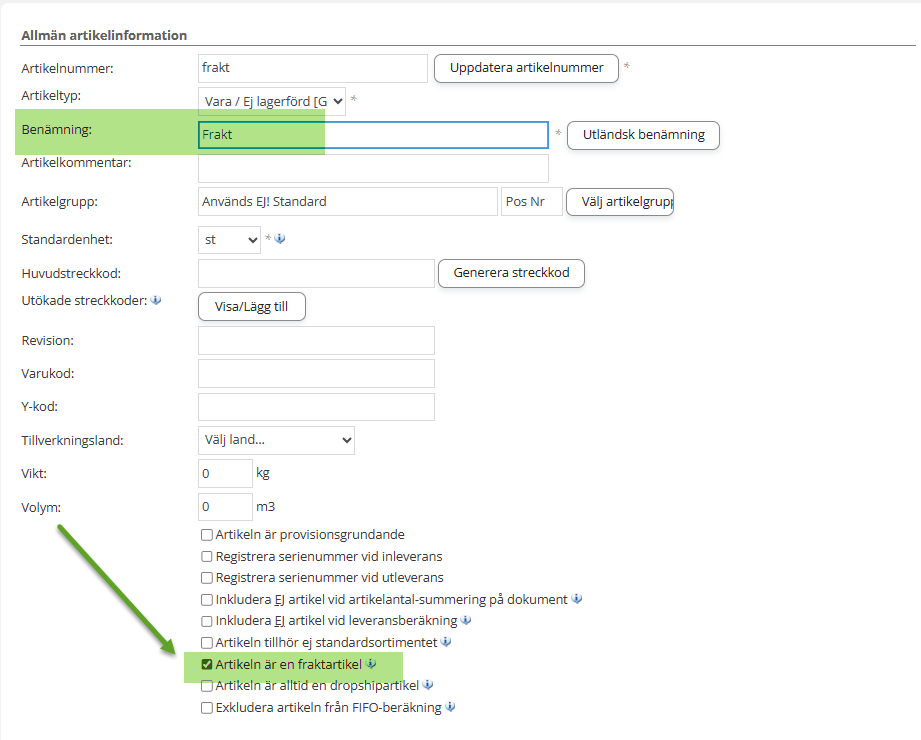 Viktigt! Gå nu igenom nedanstående punktlista för att säkerställa att artiklarna är korrekt uppsatta för att de skall visas korrekt på er handelsfaktura.