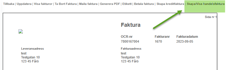 - För att hitta fälten som skall fyllas i innan skapande av handelsfakturan finner du enligt bild nedan när en vanlig faktura är skapad.
