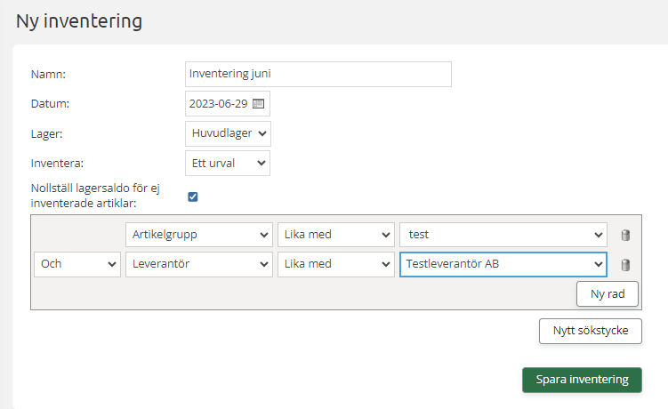 Klicka på "Ny inventering" i toppmenyn. Skapa en inventering. Välj datum då lagret inventeras, aktuellt lager samt om du önskar inventera alla artiklar eller ett urval (t.ex en viss artikelgrupp eller artiklar som tillhör en viss leverantör, eller en kombination av dessa).