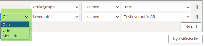 I det här fallet kommer alla artiklar med som antingen ligger i artikelgruppen Bord eller i artikelgruppen Soffor. Notera att om operatorn ”eller” byts ut mot ”och” görs istället ett urval av artiklar som ligger både i artikelgruppen Bord och samtidigt i artikelgruppen Soffor. Detta kommer inte att ge några träffar alls eftersom en artikel bara kan ha en artikelgrupp.