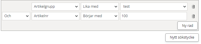 Operatorn ”och” används om du vill ställa flera krav på hur urvalet ska se ut, t.ex. att artiklarna ska ligga i en särskild artikelgrupp och att deras artikelnummer ska ha ett särskilt utseende.