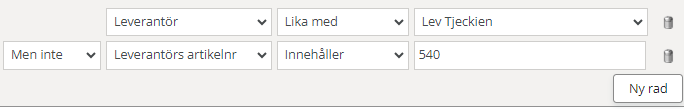 Operatorn ”men inte” kan användas för att utesluta vissa resultat, t.ex. om du vill inventera alla artiklar från en viss leverantör utom de som har ett artikelnummer som innehåller 540.